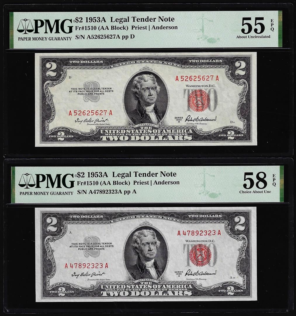 One Lot of (2) 1953A $2 Legal Tender Notes Fr.1510 PMG About Uncirculated 55EPQ/58EPQ. PMG Certified.