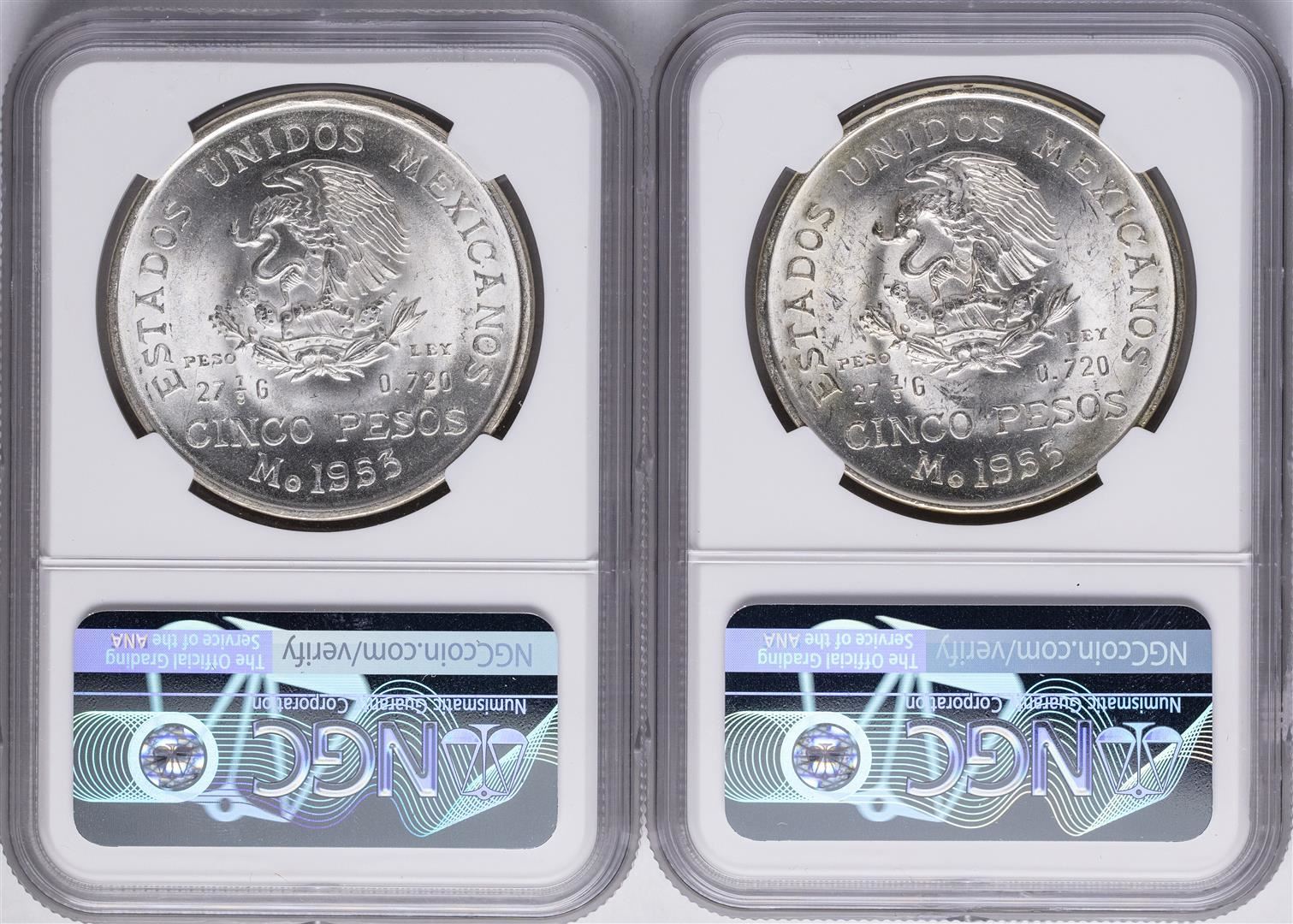 One Lot of (2) 1953Mo Mexico 5 Pesos Silver Coins NGC MS64. NGC Certified.