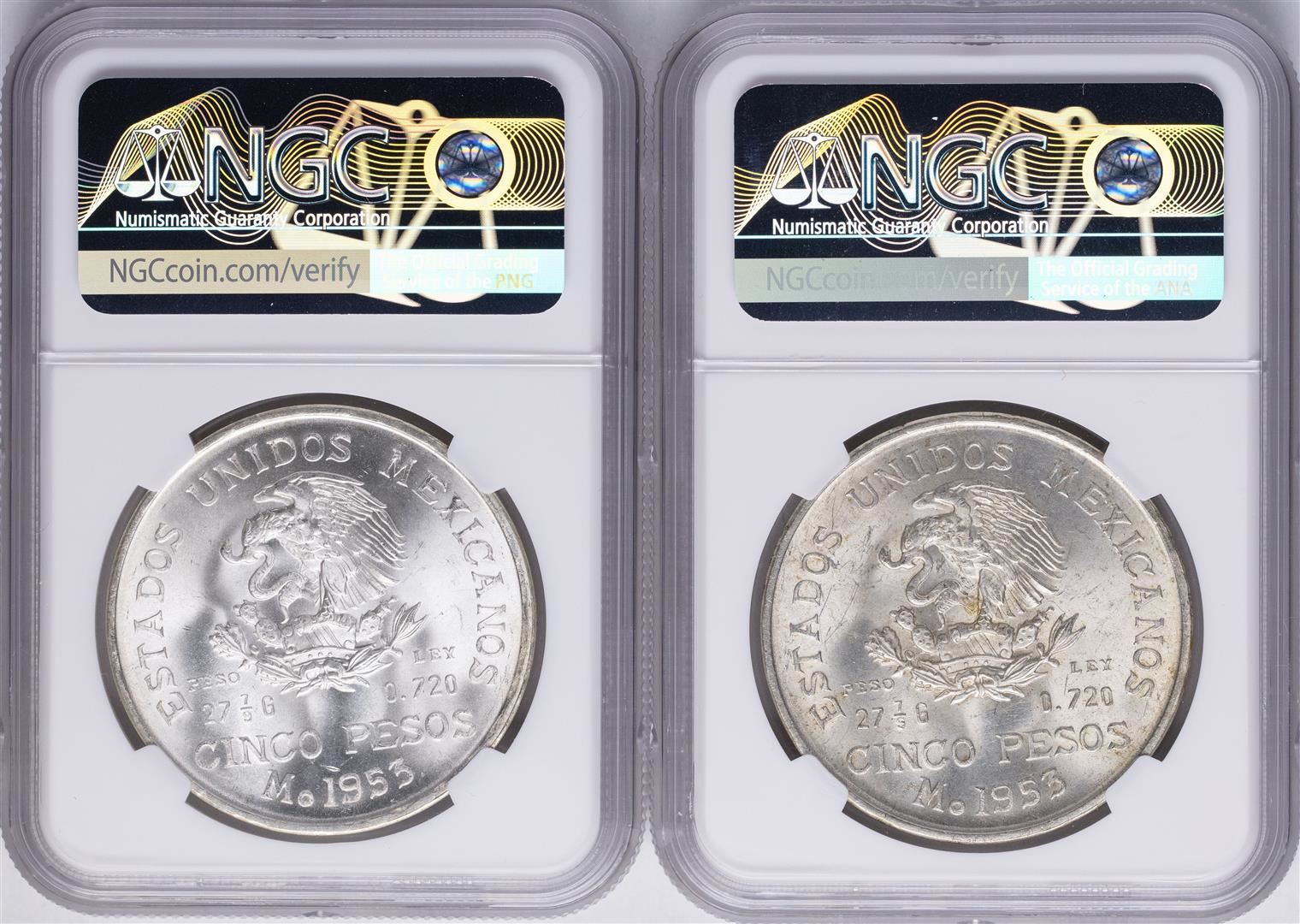 Lot of (2) 1953Mo Mexico Hidalgo Bicentennial 5 Pesos Silver Coins NGC MS64