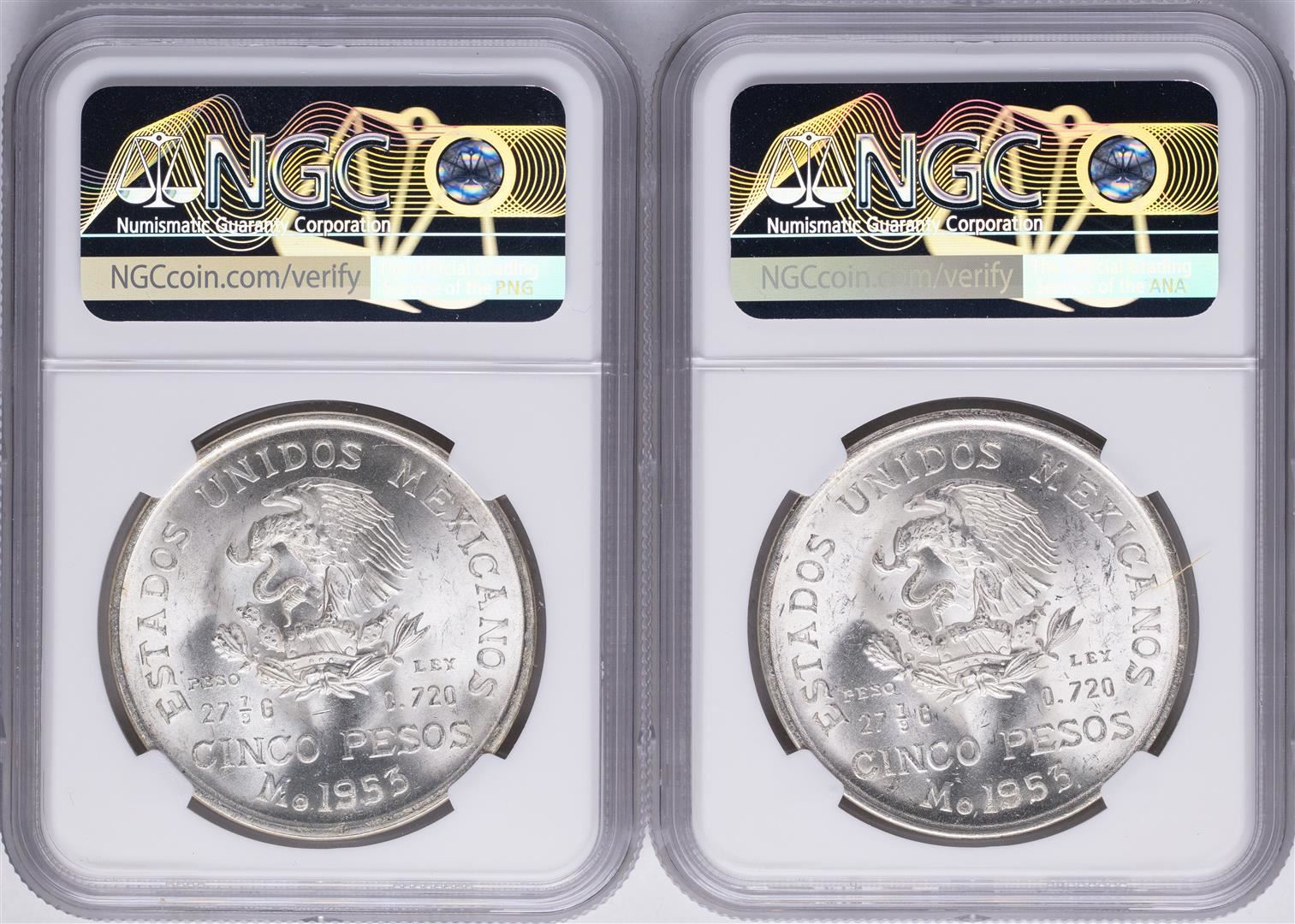 Lot of (2) 1953Mo Mexico Hidalgo Bicentennial 5 Pesos Silver Coins NGC MS64