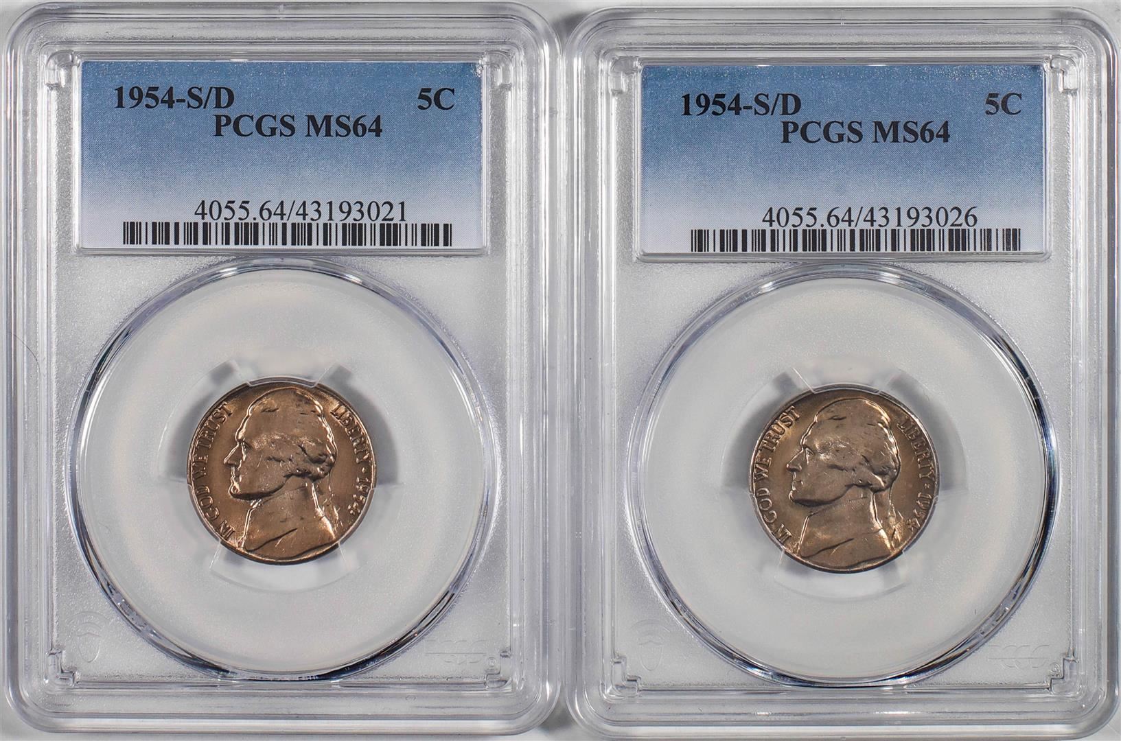 One Lot of (2) 1954-S/D Jefferson Nickel Coins PCGS MS64. PCGS Graded.