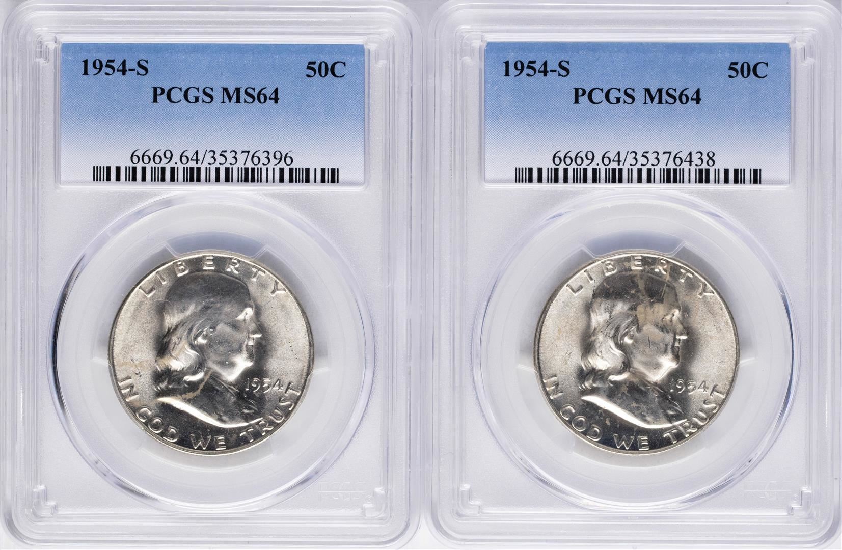 One Lot of (2) 1954-S Franklin Half Dollar Coins PCGS MS64. PCGS Graded.