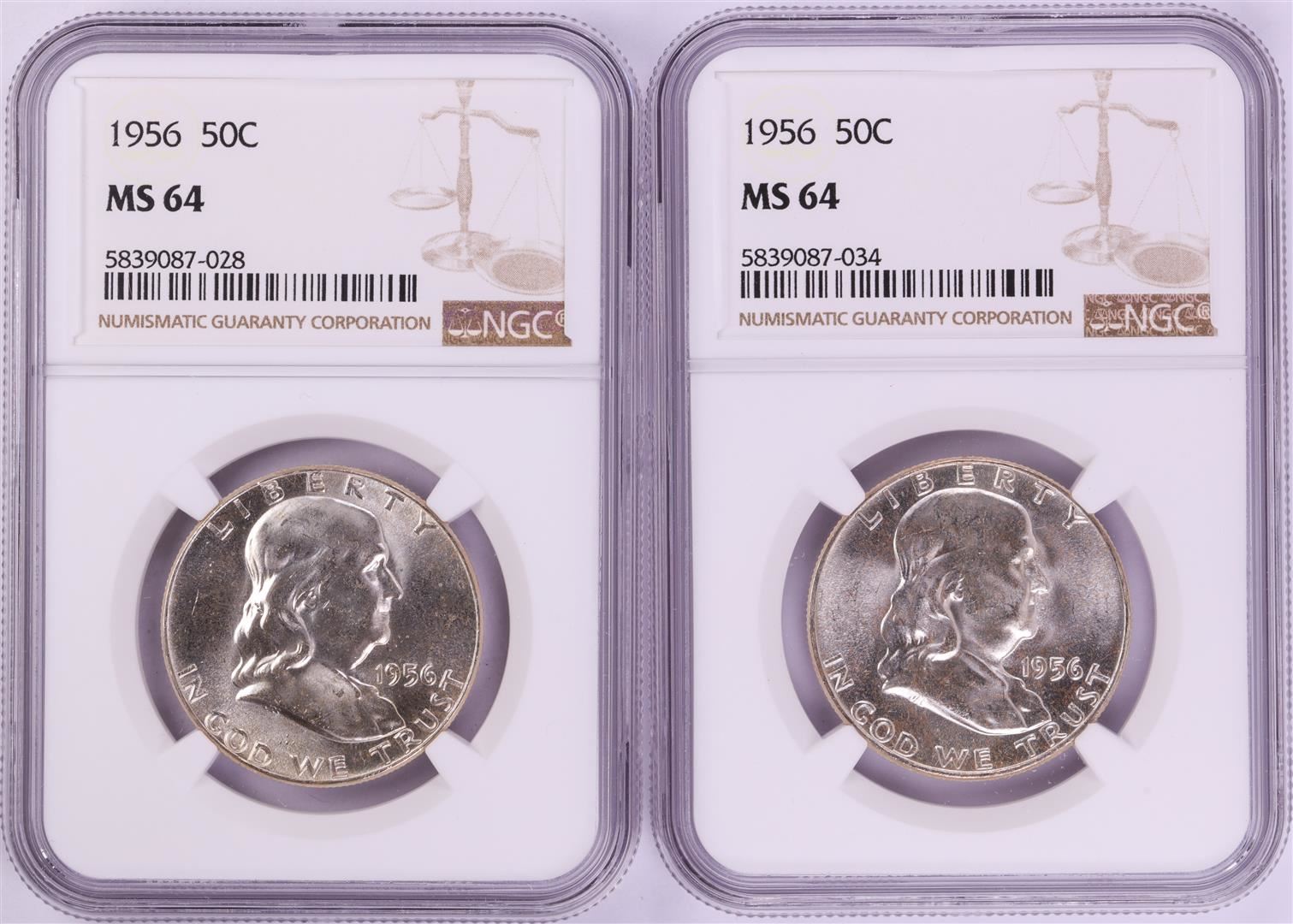 One Lot of (2) 1956 Franklin Half Dollar Coins NGC MS64. NGC Certified.