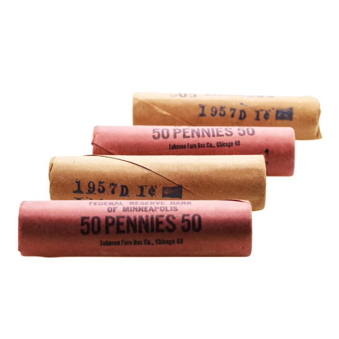 One Lot of (2) 1957-D & 1958-D (50) Brilliant Uncirculated Lincoln Wheat Cent Coin Rolls.