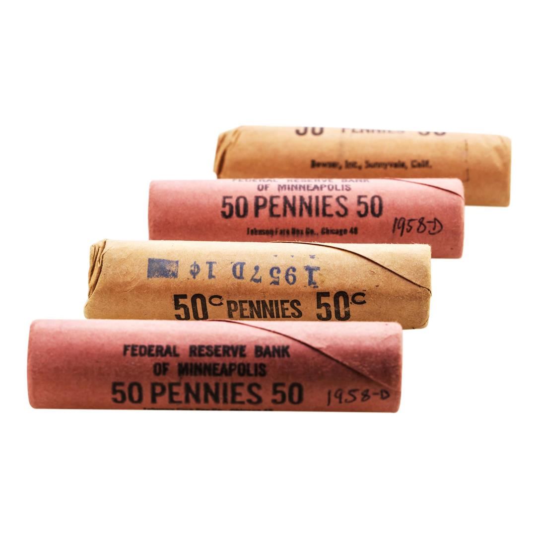 One Lot of (2) 1957-D & (2) 1958-D Lincoln Wheat Cent Rolls.