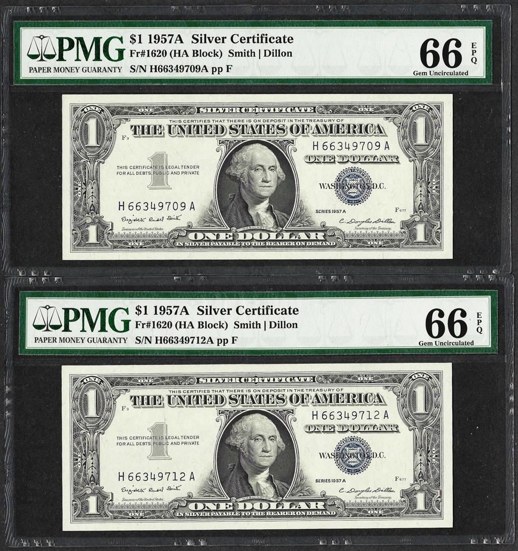 One Lot of (2) 1957A $1 Silver Certificate Notes Fr.1620 PMG Gem Uncirculated 66EPQ. PMG Certified.