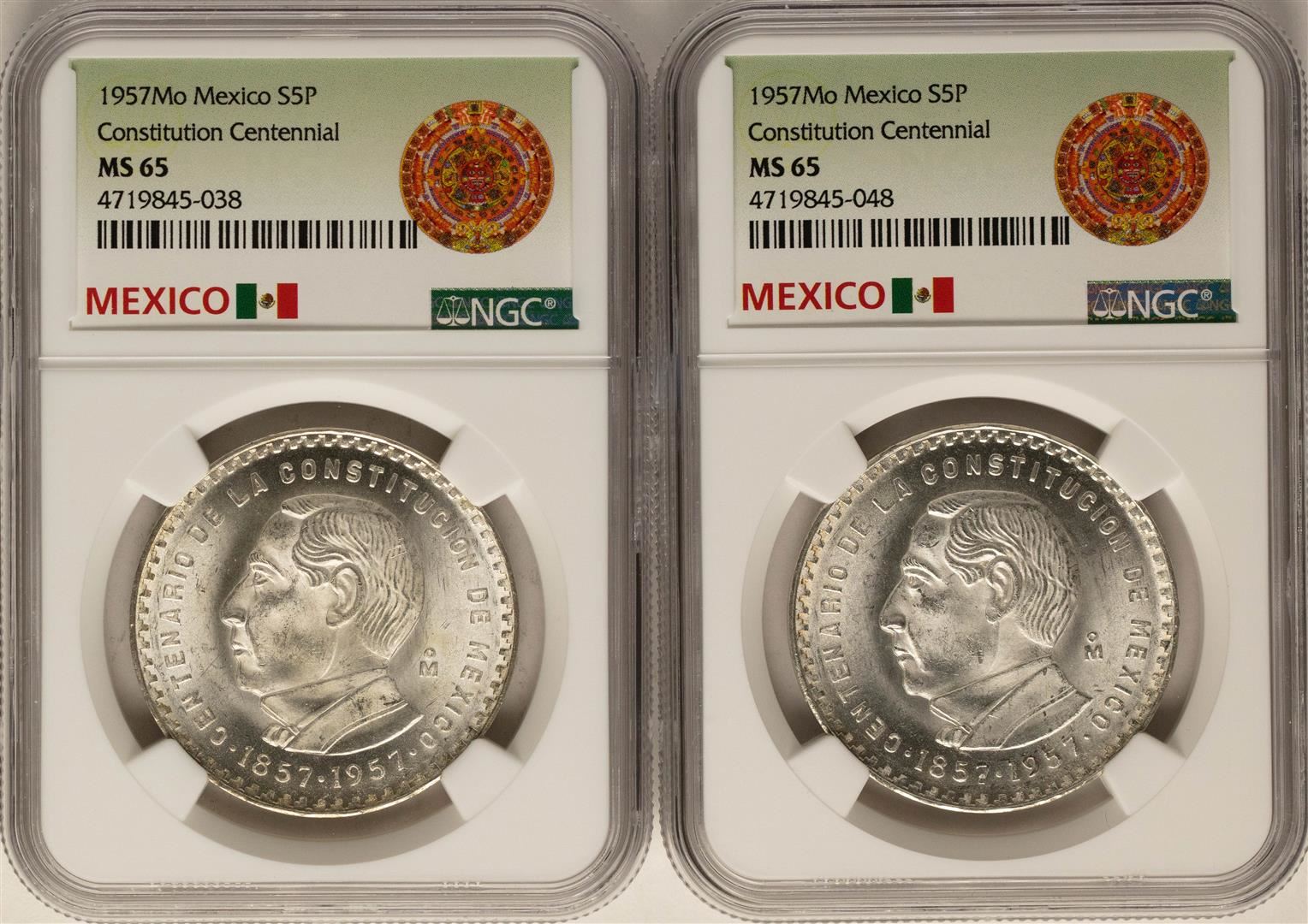 Lot of (2) 1957Mo Mexico 5 Pesos Constitution Centennial Silver Coins NGC MS65