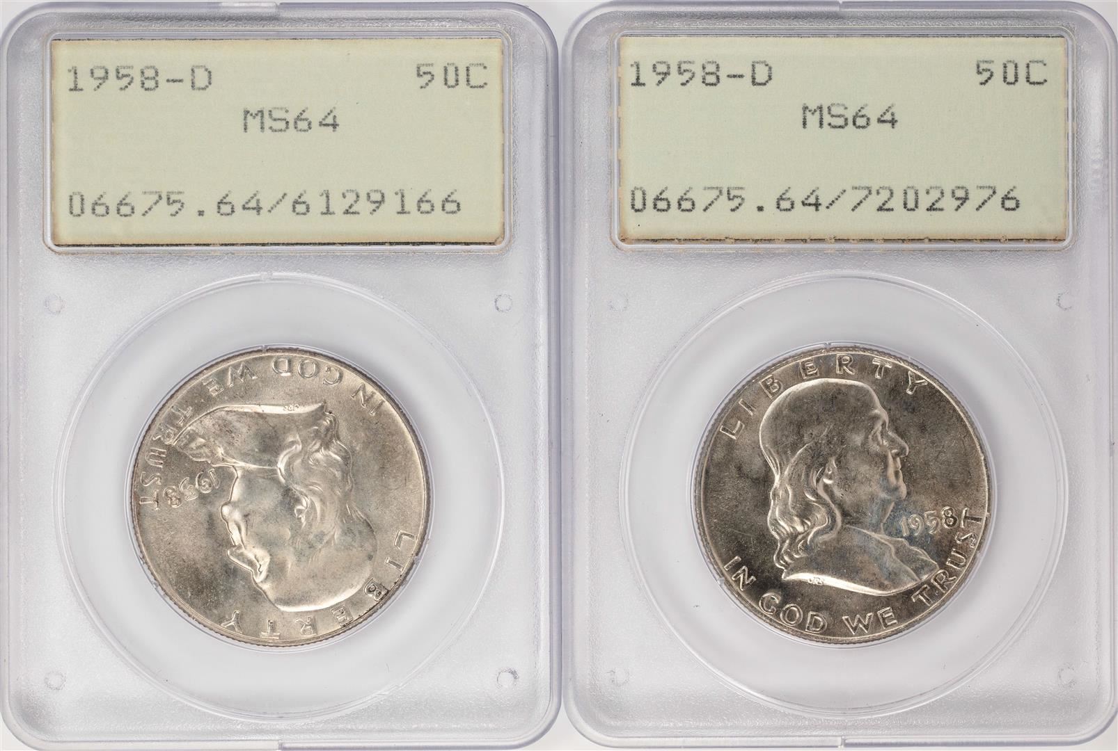 One Lot of (2) 1958-D Franklin Half Dollar Coins PCGS MS64 Old Green Rattlers. PCGS Graded.