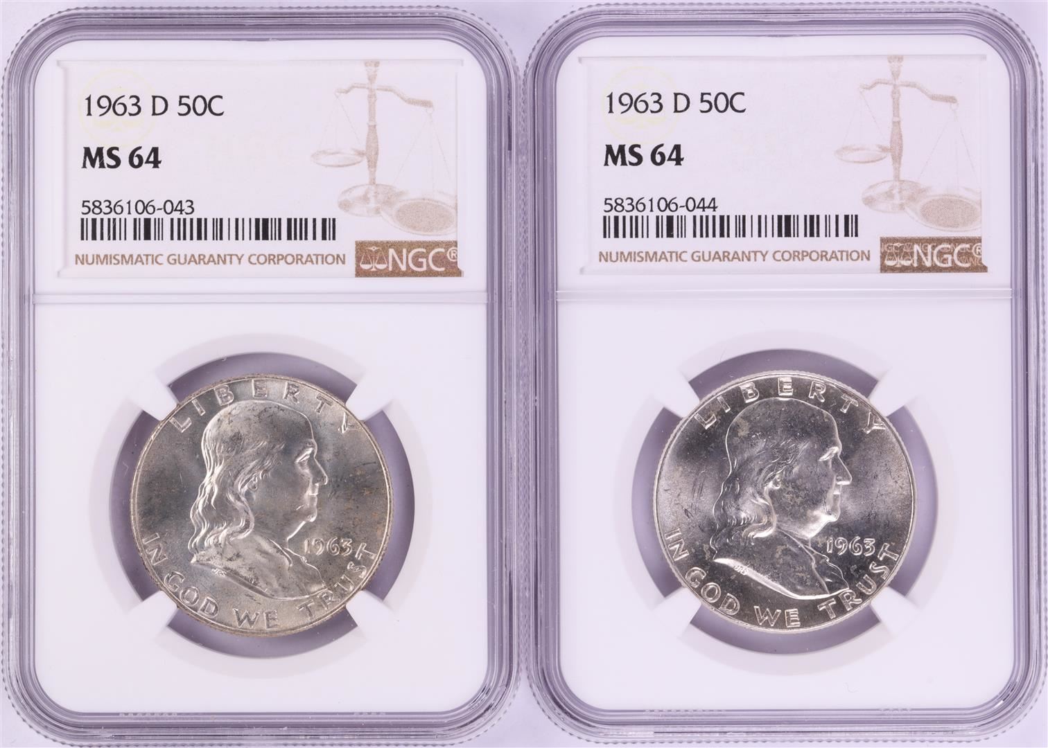 One Lot of (2) 1963-D Franklin Half Dollar Coins NGC MS64. NGC Certified.