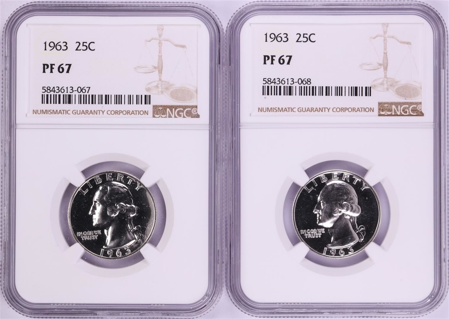 One Lot of (2) 1963 Proof Washington Quarter Coins NGC PF67. NGC Certified.