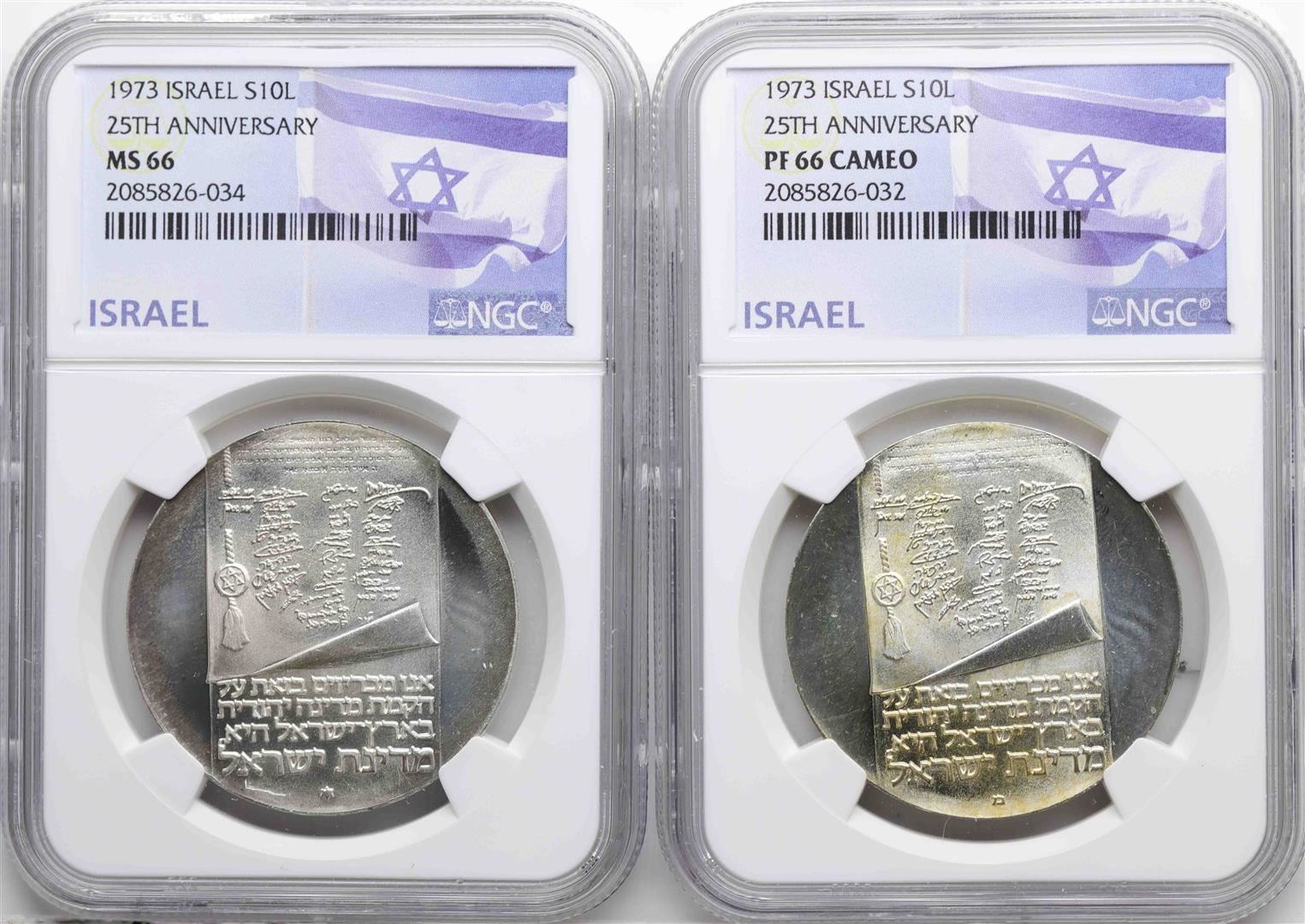 Lot of (2) 1973 Israel 10 Lirot Silver Coins NGC PF65 Ultra Cameo & MS65