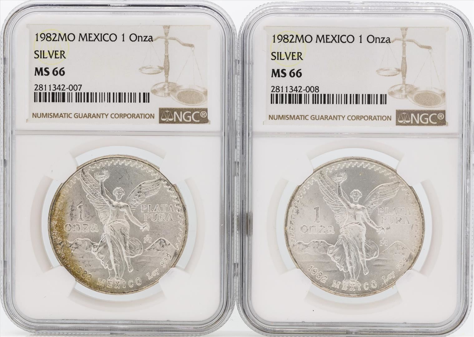 One Lot of (2) 1982MO Mexico Libertad Silver Coins NGC MS66. NGC Certified.