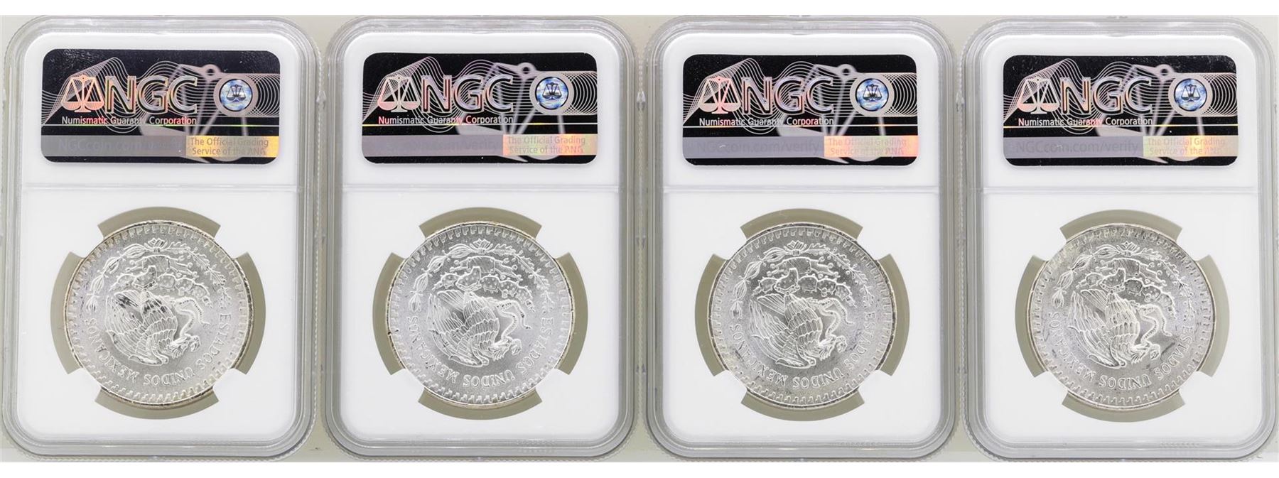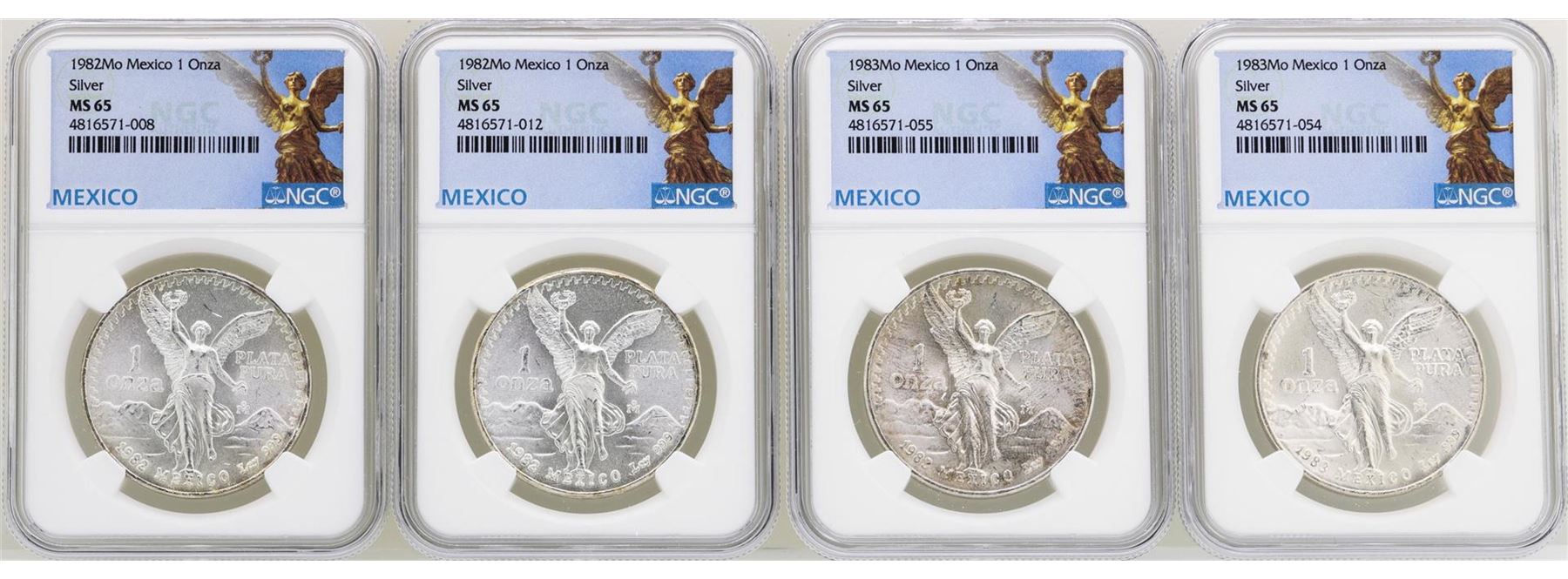 One Lot of (2) 1982Mo & (2) 1983Mo Mexico Libertad Onza Silver Coins NGC MS65. NGC Certified.