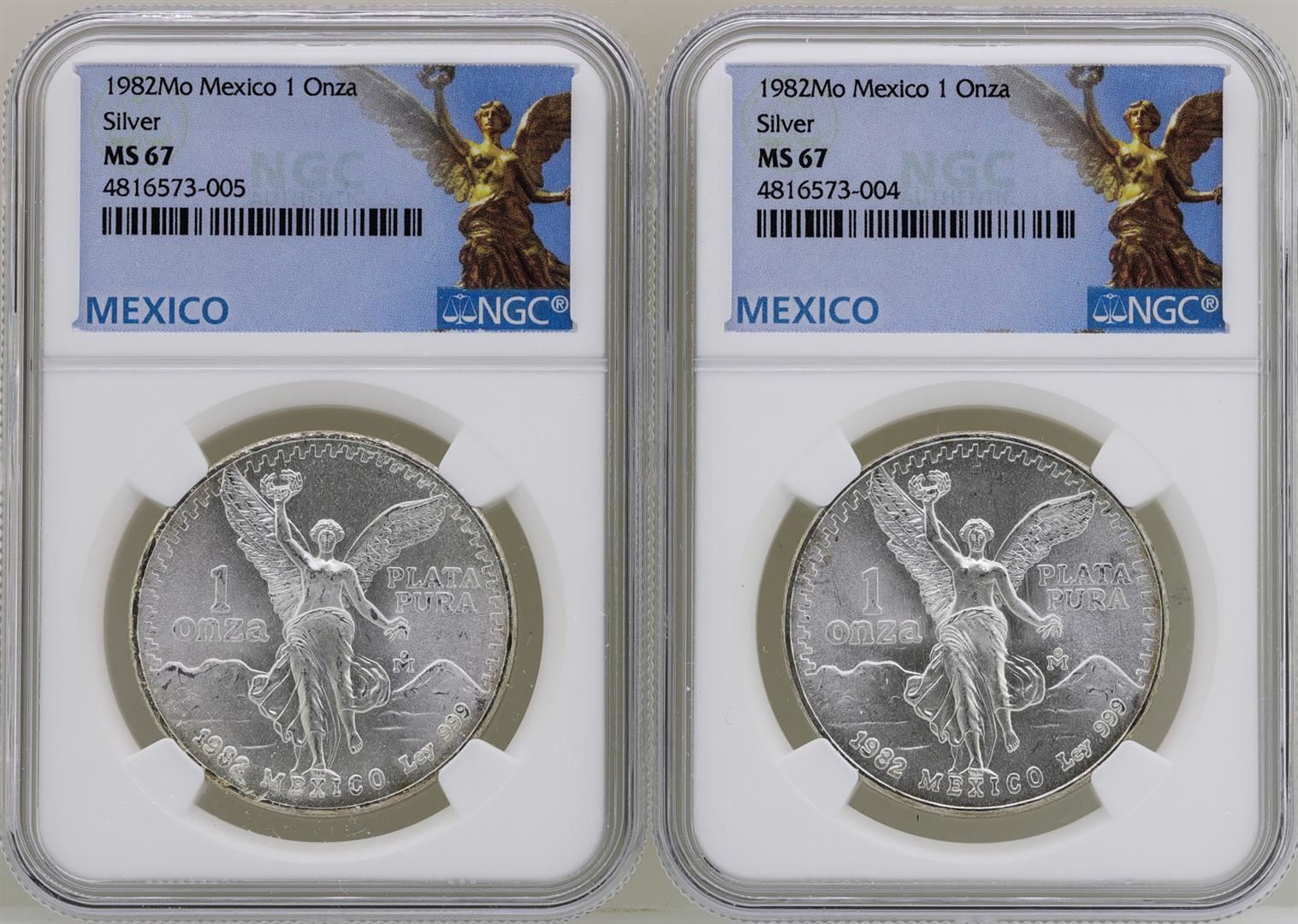 Lot of (2) 1982Mo Mexico Libertad Onza Silver Coins NGC MS67