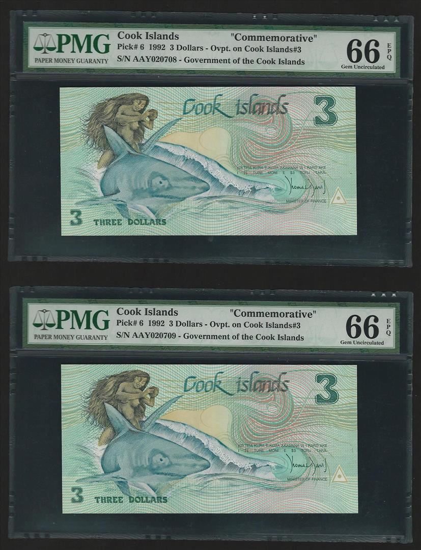 One Lot of (2) 1992 $3 Cook Islands Commemorative Currency Note PMG Gem Unc 66EPQ. PMG Certified.