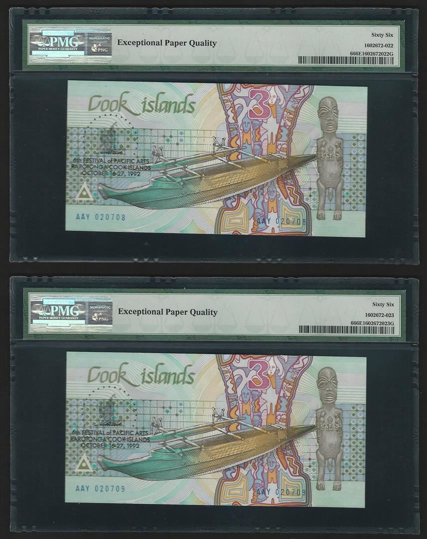One Lot of (2) 1992 $3 Cook Islands Commemorative Currency Note PMG Gem Unc 66EPQ. PMG Certified.