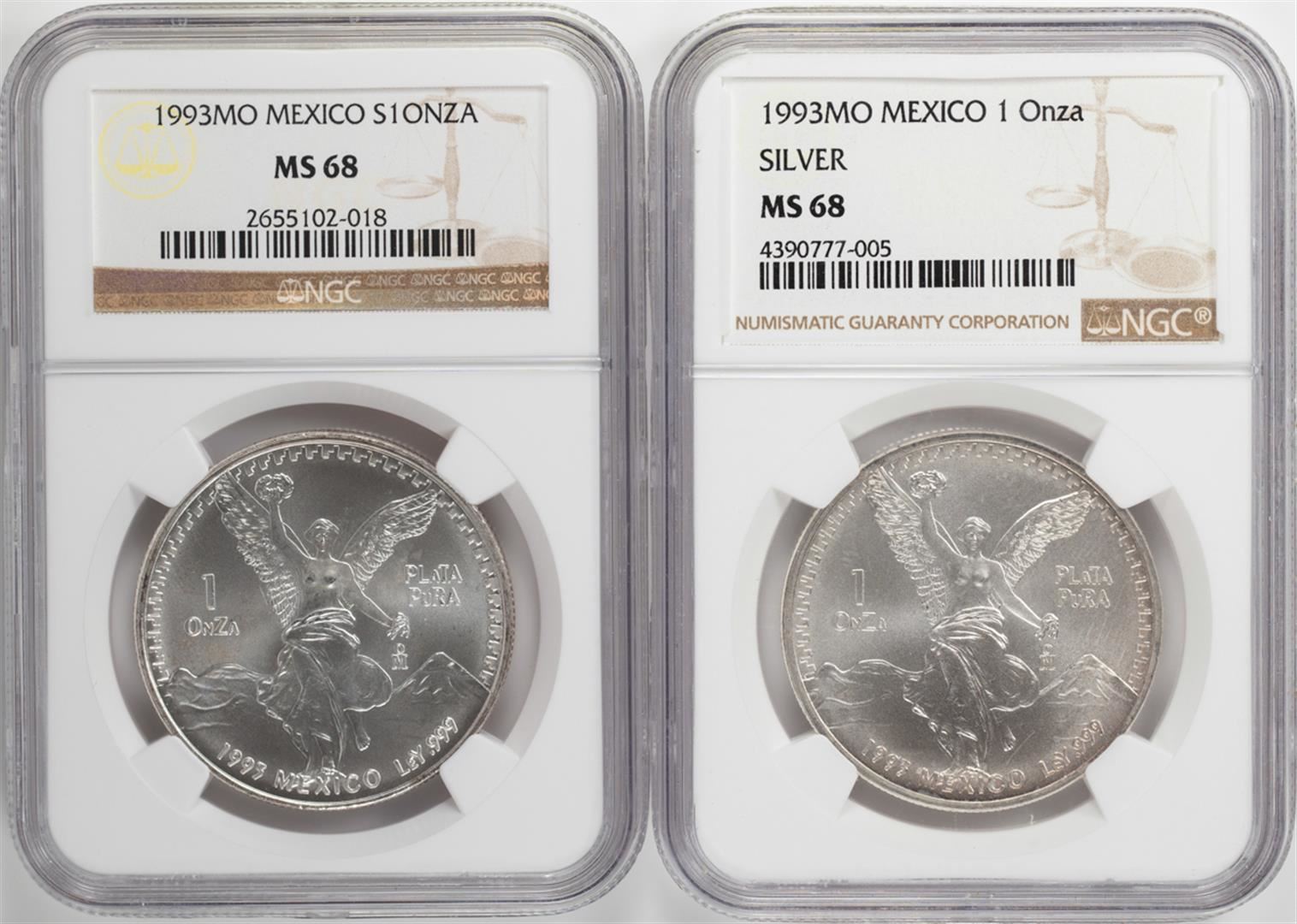 Lot of (2) 1993 MO Mexico Libertad 1 Onza Silver Coins NGC MS68