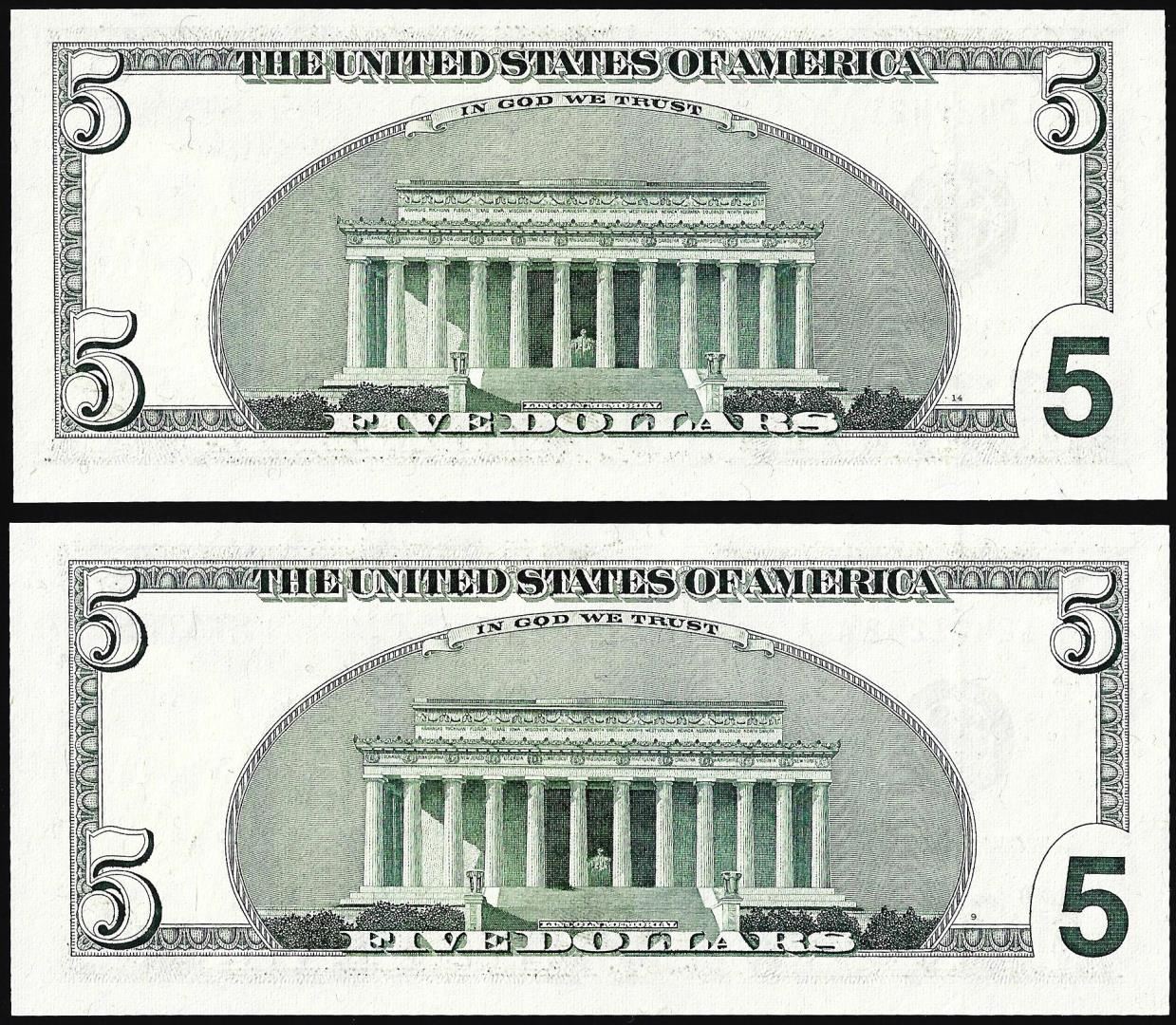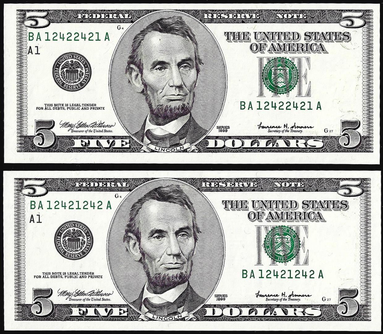 Lot of (2) 1999 $5 Federal Reserve Notes Radar & Repeater Serial Numbers