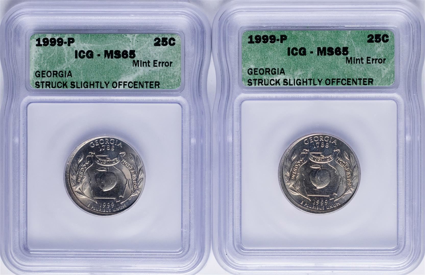 One Lot of (2) 1999-P Georgia State Quarter Coins ICG MS65 Struck Slightly Offcenter. ICG Certified.