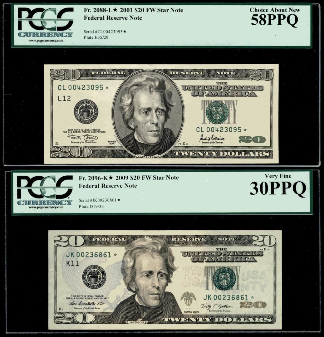Lot of (2) 2001/2009 $20 Federal Reserve STAR Notes PCGS Graded