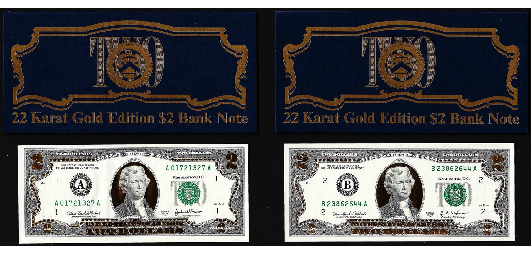Lot of (2) 2003A 22KT Gold Leaf $2 Federal Reserve Notes Uncirculated in Envelope