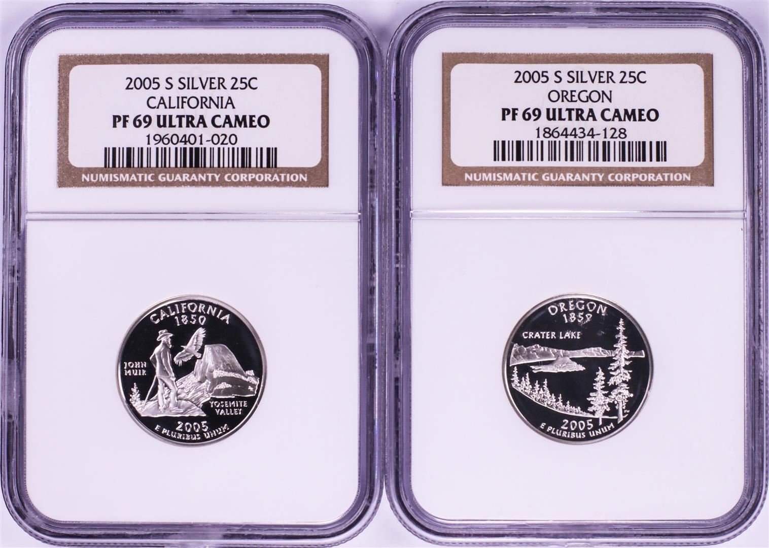 One Lot of (2) 2005-S Proof Silver State Quarter Coins NGC PF69 Ultra Cameo.