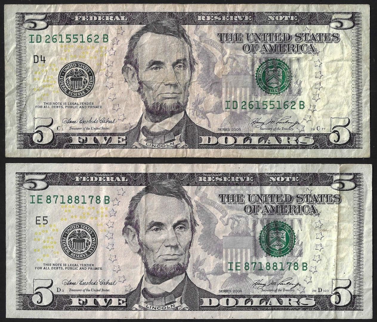 Lot of (2) 2006 $5 Federal Reserve Notes Fancy Radar Serial Numbers