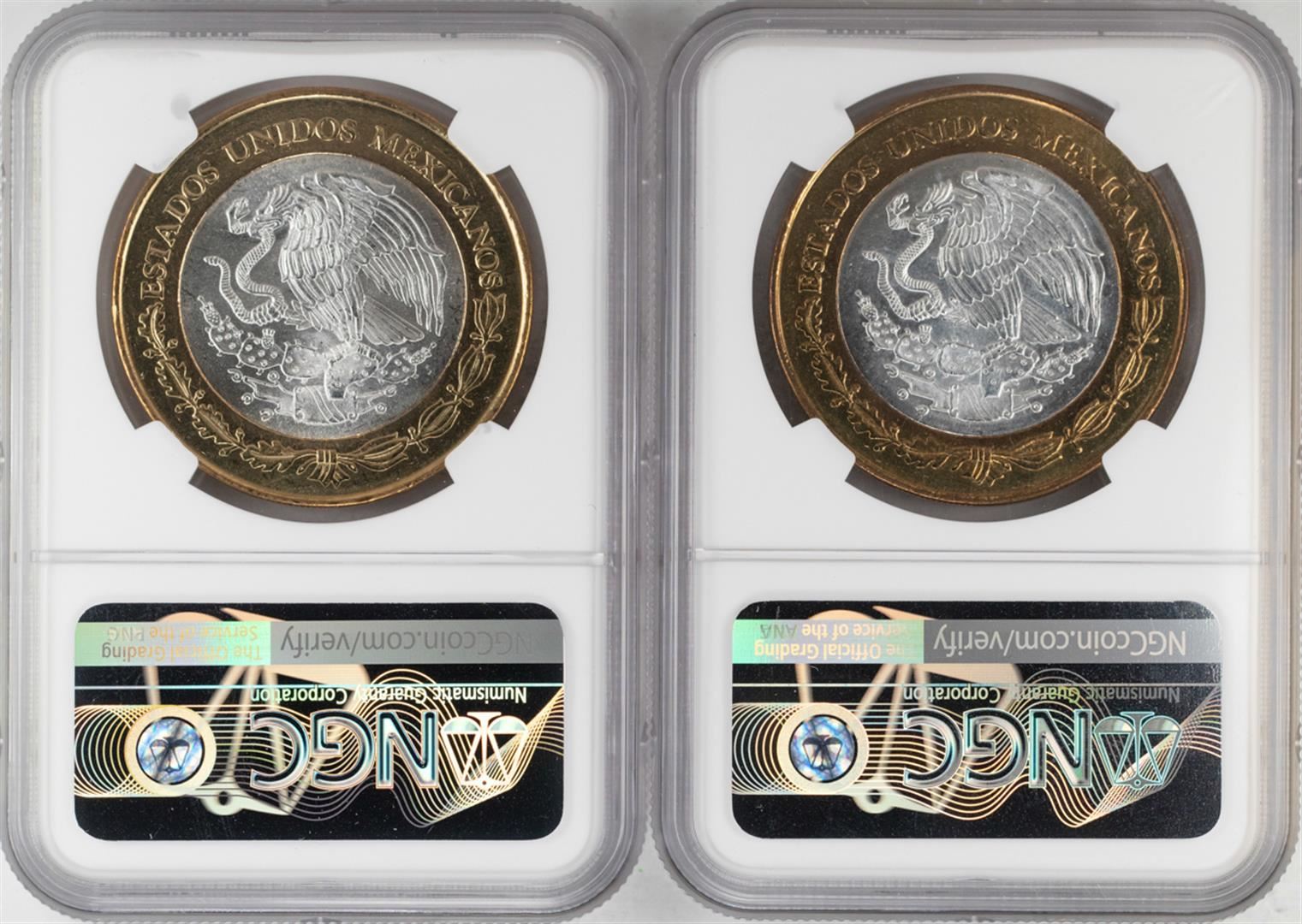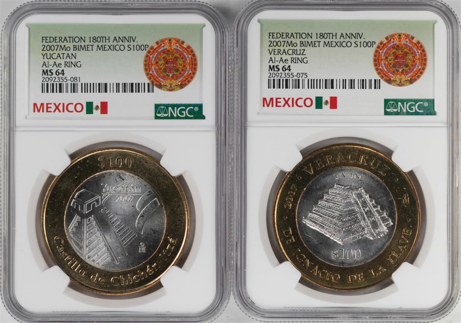 Lot of (2) 2007Mo Mexico Bi-metal 100 Pesos Silver Coins NGC MS64