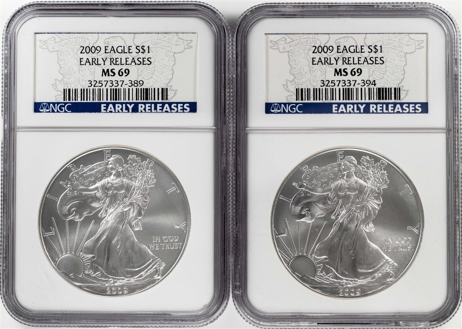 One Lot of (2) 2009 $1 American Silver Eagle Coins NGC MS69 Early Releases. NGC Certified.