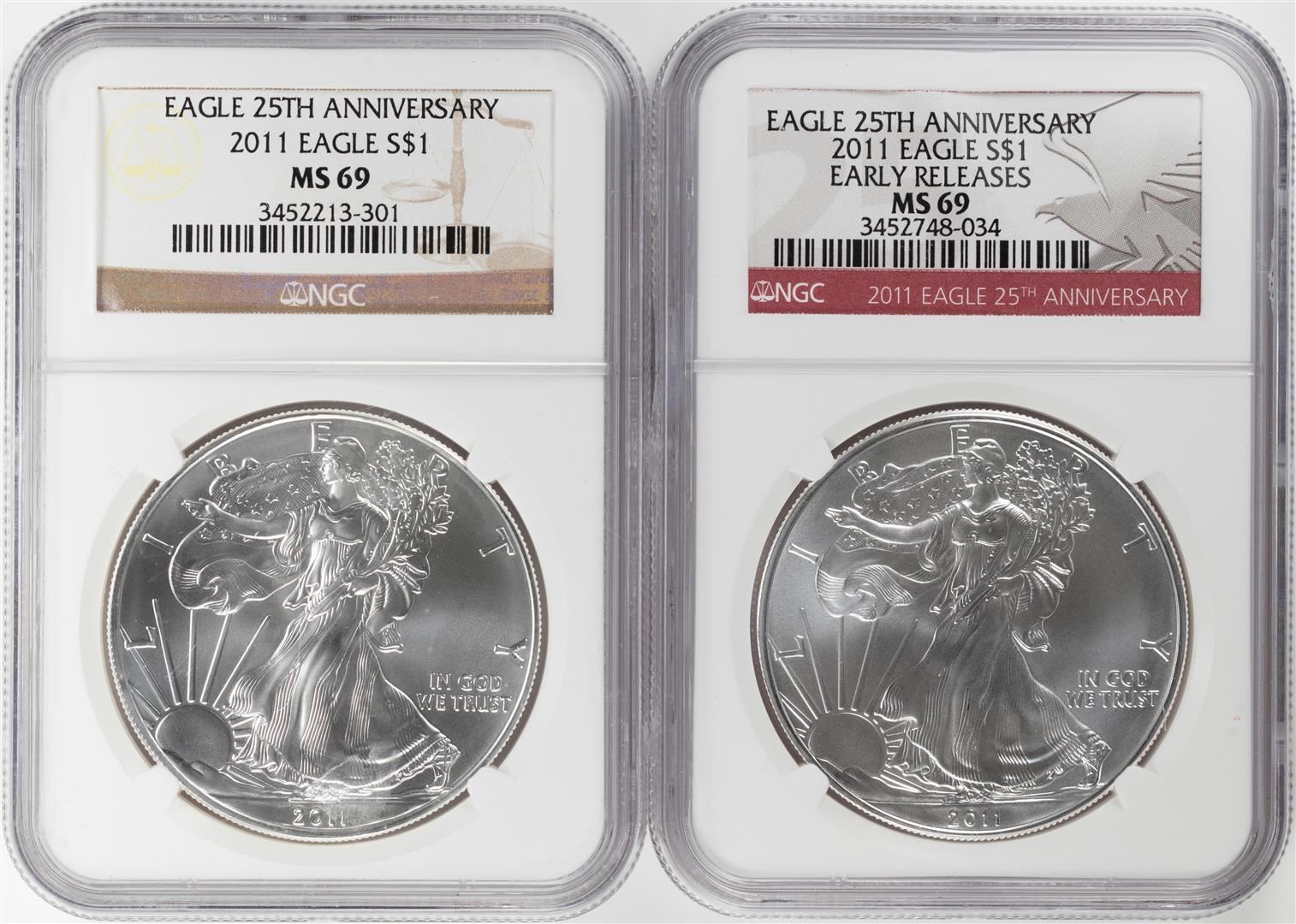 One Lot of (2) 2011 $1 American Silver Eagle Coins NGC MS69. NGC Certified.