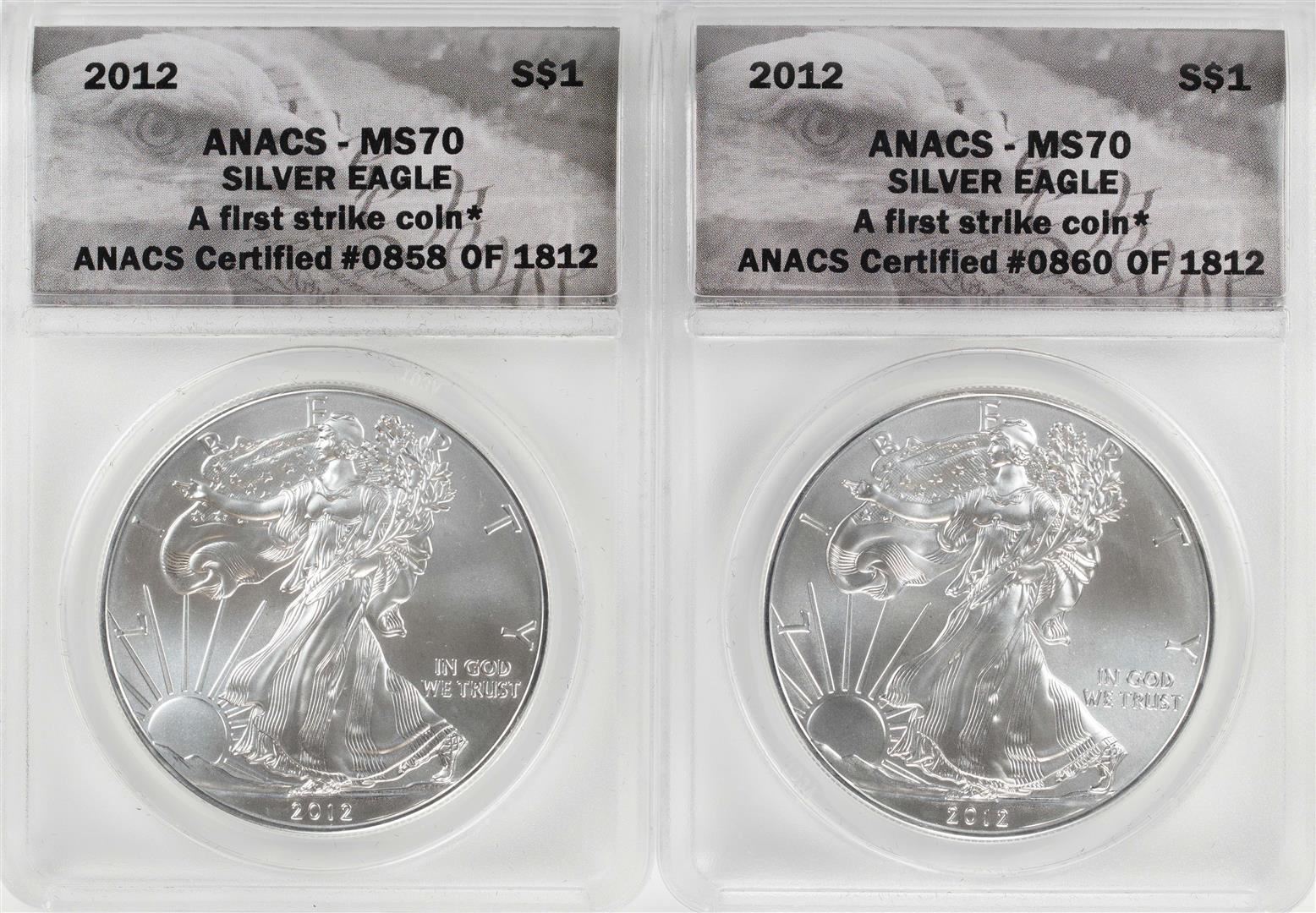 One Lot of (2) 2012 $1 American Silver Eagle Coins ANACS MS70 First Strike. ANACS Certified.