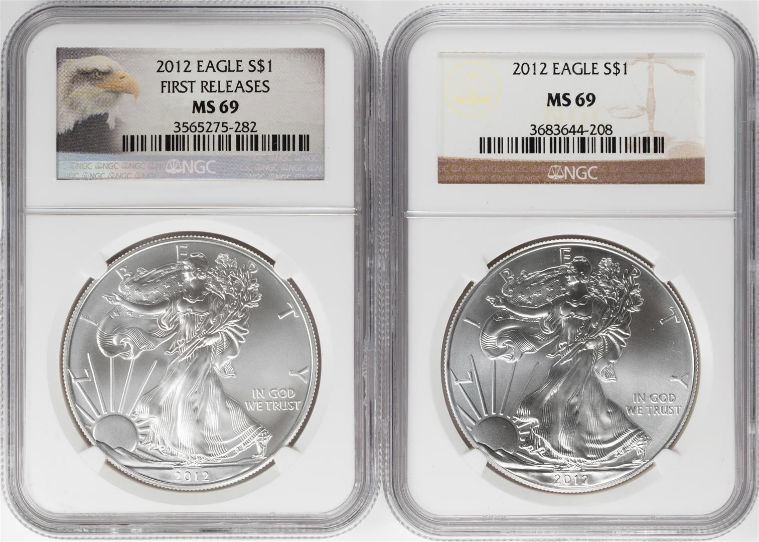 One Lot of (2) 2012 $1 American Silver Eagle Coins NGC MS69. NGC Certified.