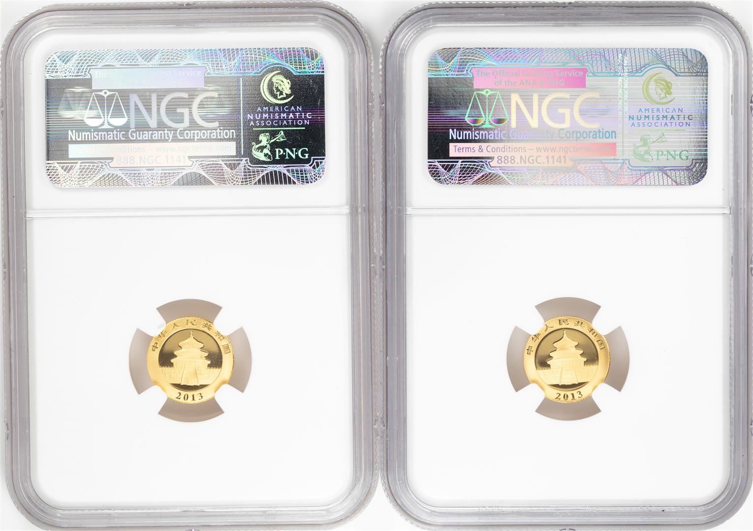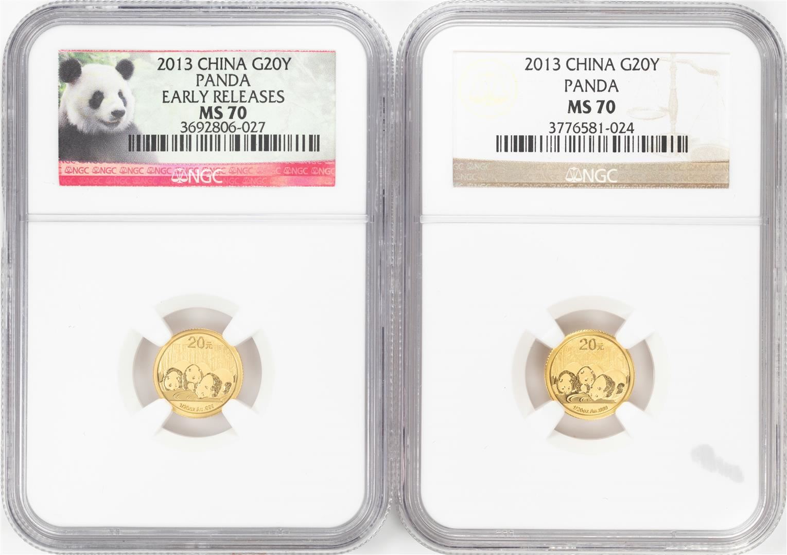 One Lot of (2) 2013 China 20 Yuan Panda Gold Coins NGC MS70. NGC Certified.