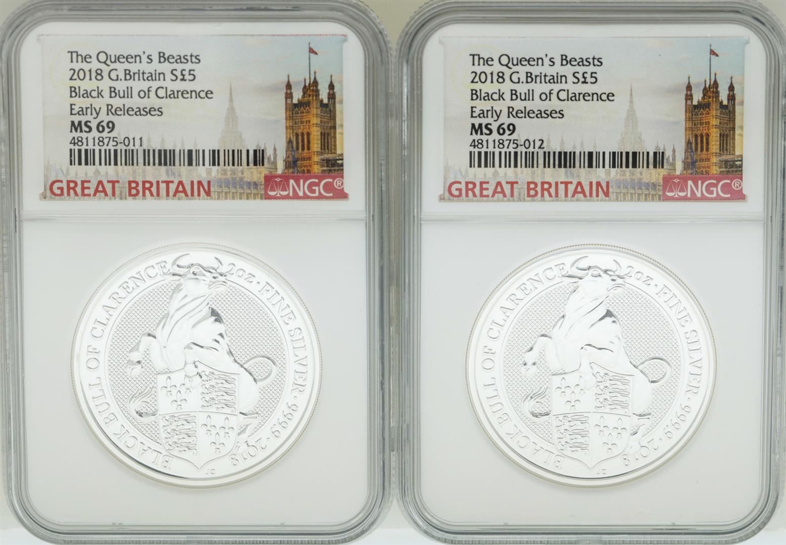 One Lot of (2) 2018 Great Britain 5 Pound Queen's Beasts Silver Coins NGC MS69 Early Releases. NGC Certified.