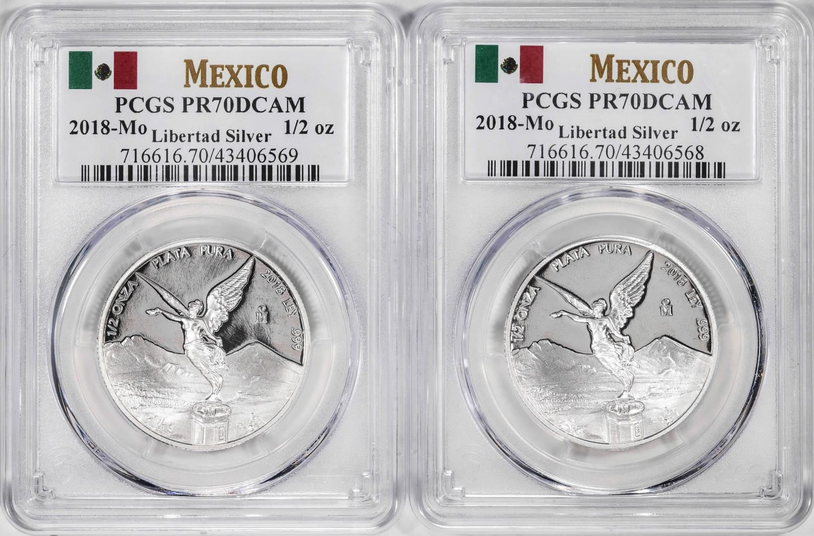 Lot of (2) 2018-Mo Mexico Proof 1/2 oz Silver Libertad Coins PCGS PR70DCAM