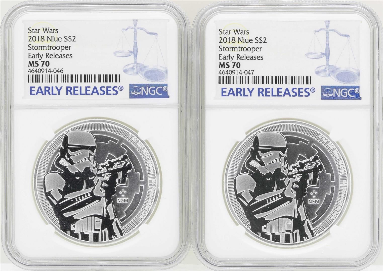 One Lot of (2) 2018 Niue $2 Star Wars Stormtrooper Silver Coins NGC MS70 Early Releases. NGC Certified.