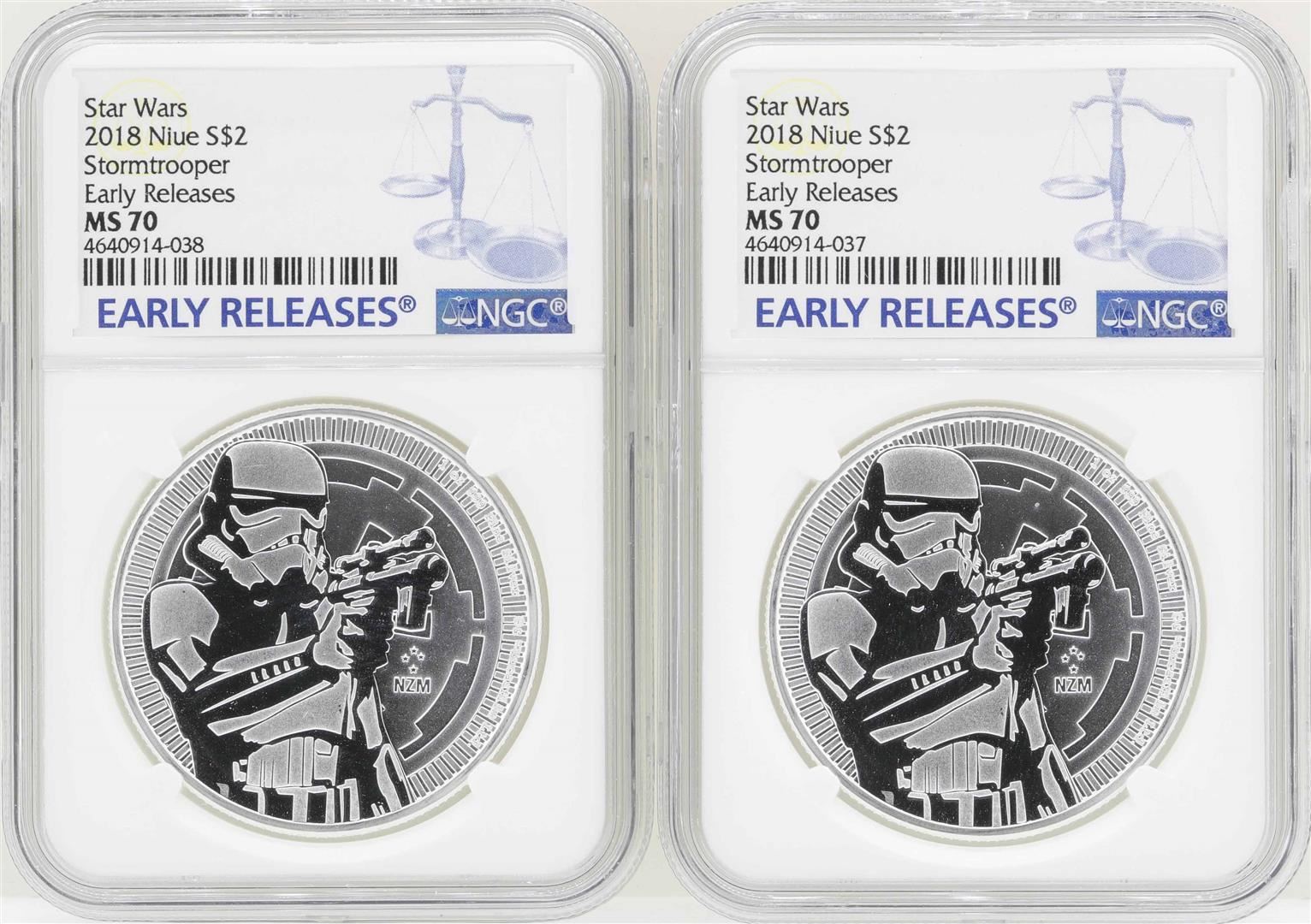 One Lot of (2) 2018 Niue $2 Star Wars Stormtrooper Silver Coins NGC MS70 Early Releases. NGC Certified.