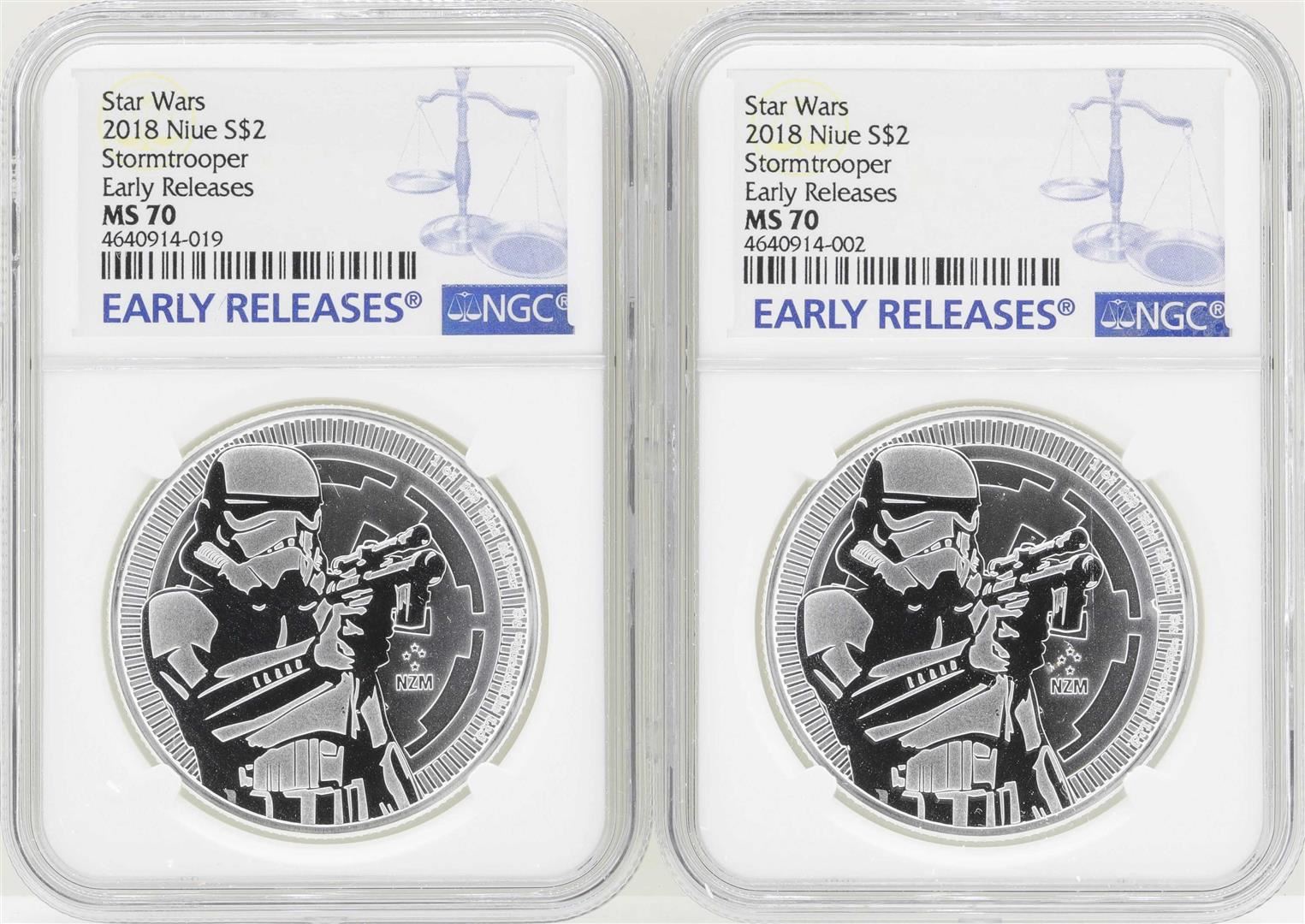 One Lot of (2) 2018 Niue $2 Star Wars Stormtrooper Silver Coins NGC MS70 Early Releases. NGC Certified.