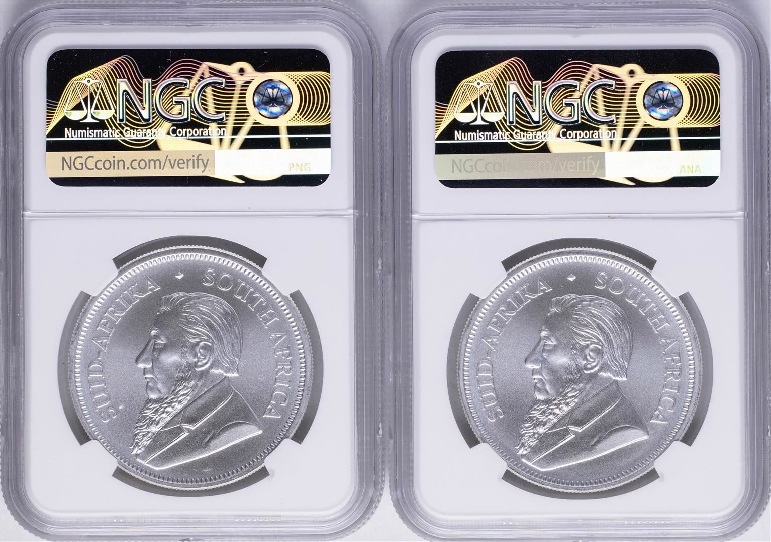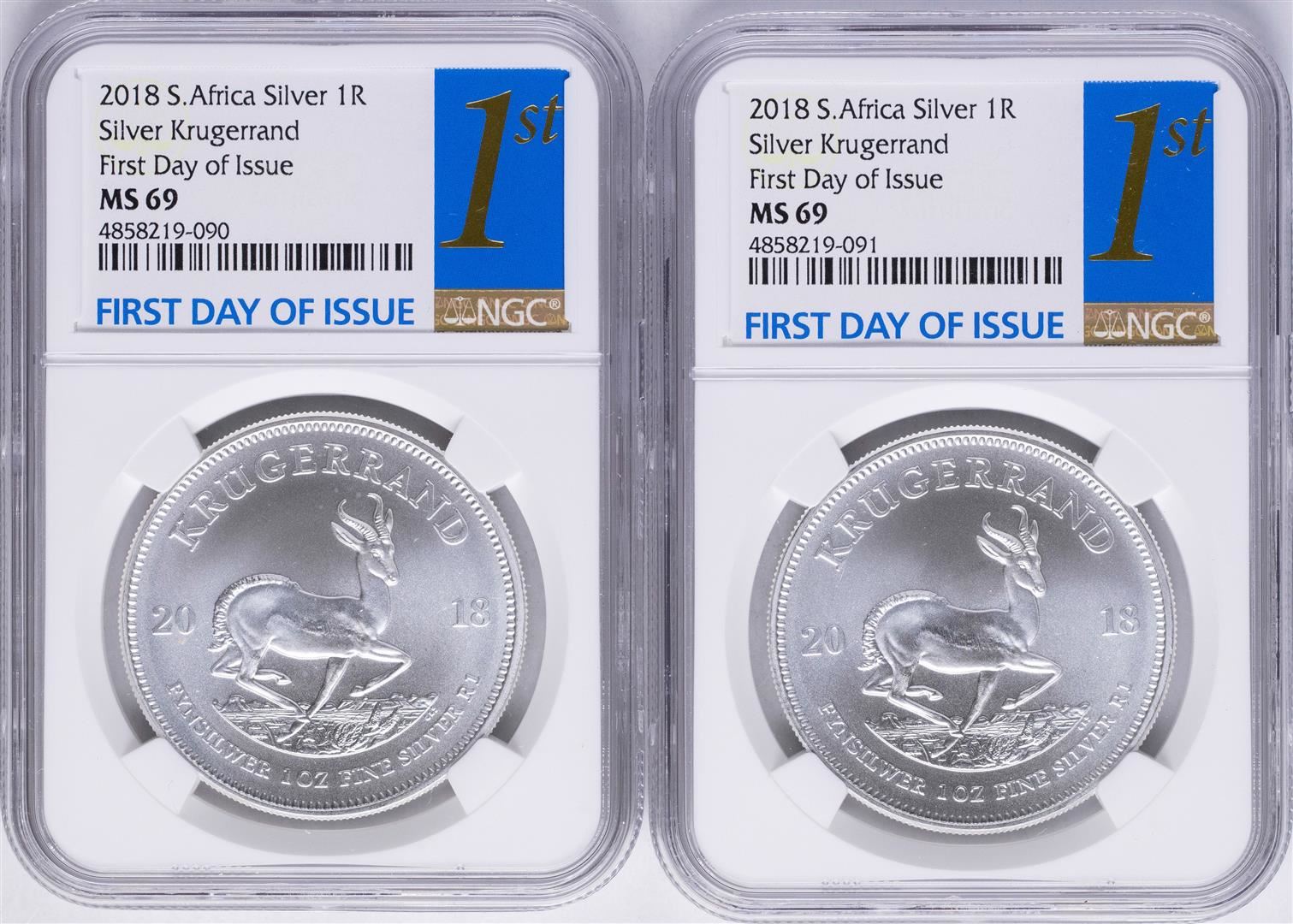 Lot of (2) 2018 South Africa Krugerrand Silver Coins NGC MS69 First Day of Issue