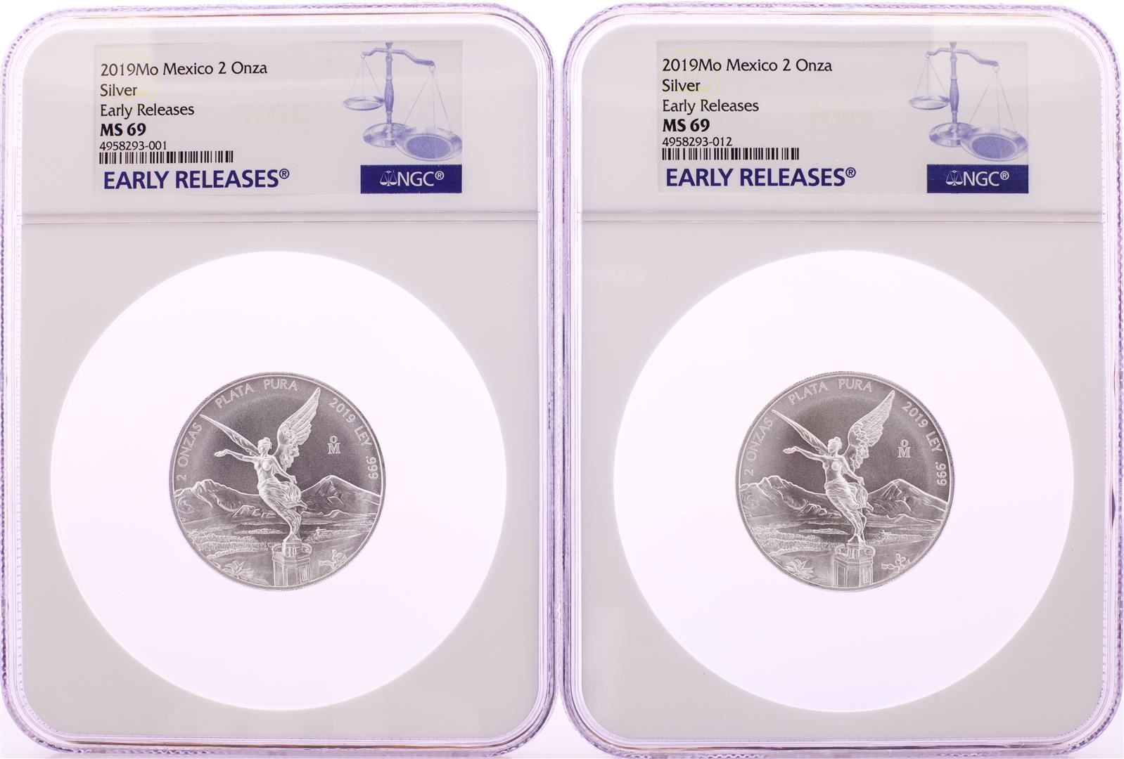 Lot of (2) 2019Mo Mexico 2 Onza Libertad Silver Coins NGC MS69 Early Releases