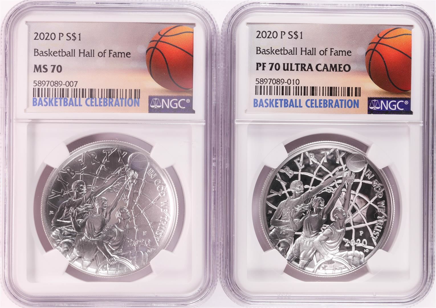 One Lot of (2) 2020 P $1 Basketball Hall of Fame Silver Coin NGC MS/PF70. NGC Certified.