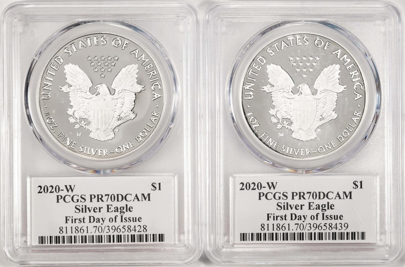One Lot of (2) 2020-W $1 Proof American Silver Eagle Coin PCGS PR70DCAM FDOI. PCGS Graded.
