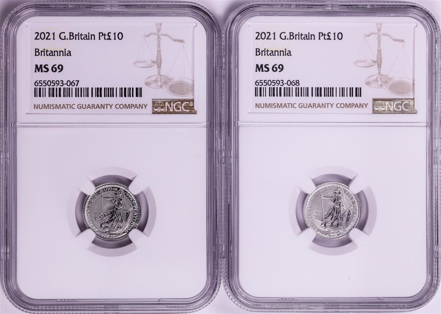 One Lot of (2) 2021 Great Britain 10 Pounds Britannia 1/10oz Platinum Coins NGC MS69. NGC Certified.