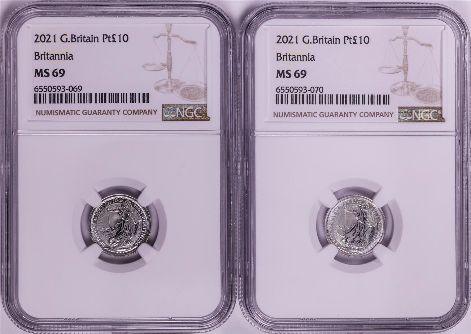 One Lot of (2) 2021 Great Britain 10 Pounds Britannia 1/10oz Platinum Coins NGC MS69. NGC Certified.