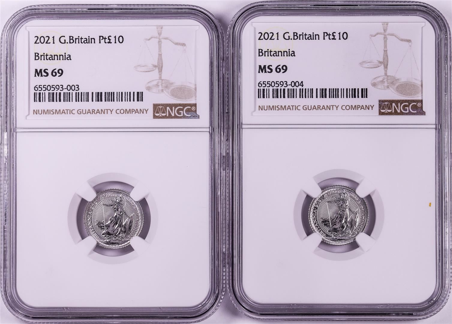 Lot of (2) 2021 Great Britain 10 Pounds Britannia 1/10oz Platinum Coins NGC MS69