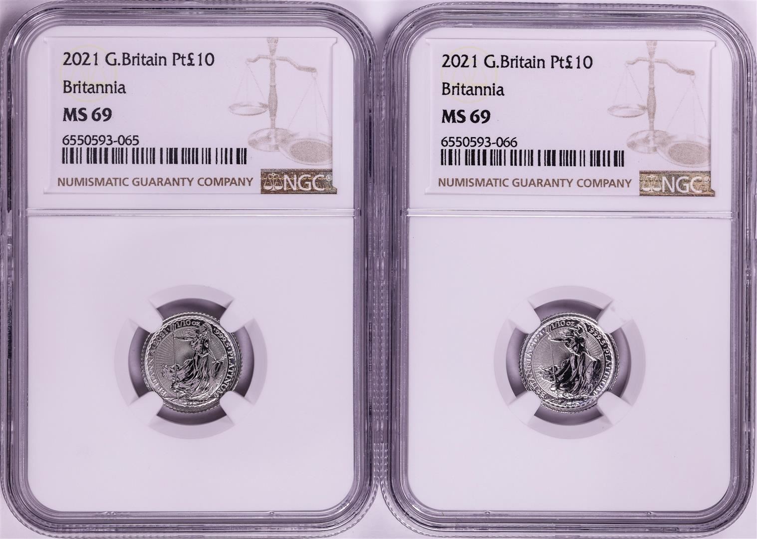 One Lot of (2) 2021 Great Britain 10 Pounds Britannia 1/10oz Platinum Coins NGC MS69. NGC Certified.