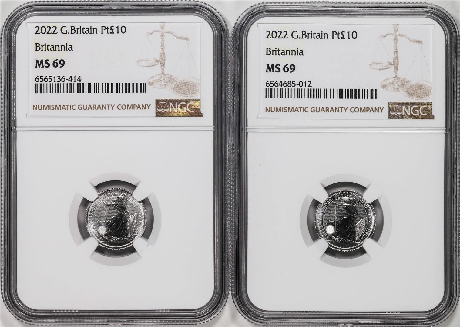 Lot of (2) 2022 Great Britain 10 Pounds Britannia 1/10oz Platinum Coins NGC MS69