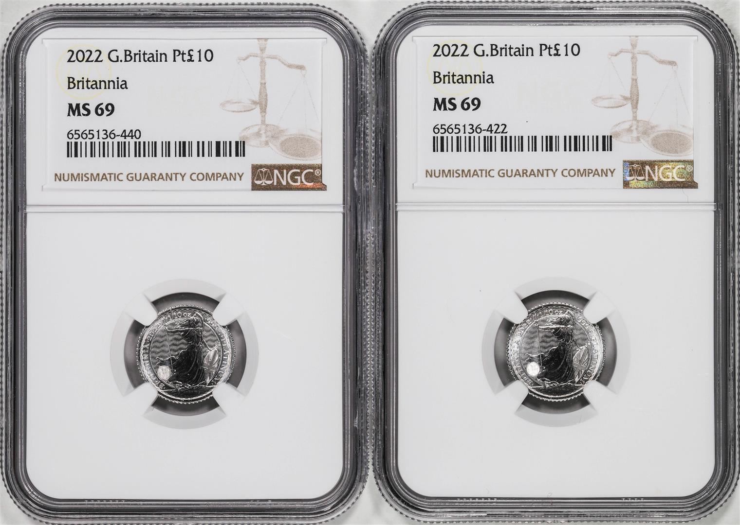 Lot of (2) 2022 Great Britain 10 Pounds Britannia 1/10oz Platinum Coins NGC MS69