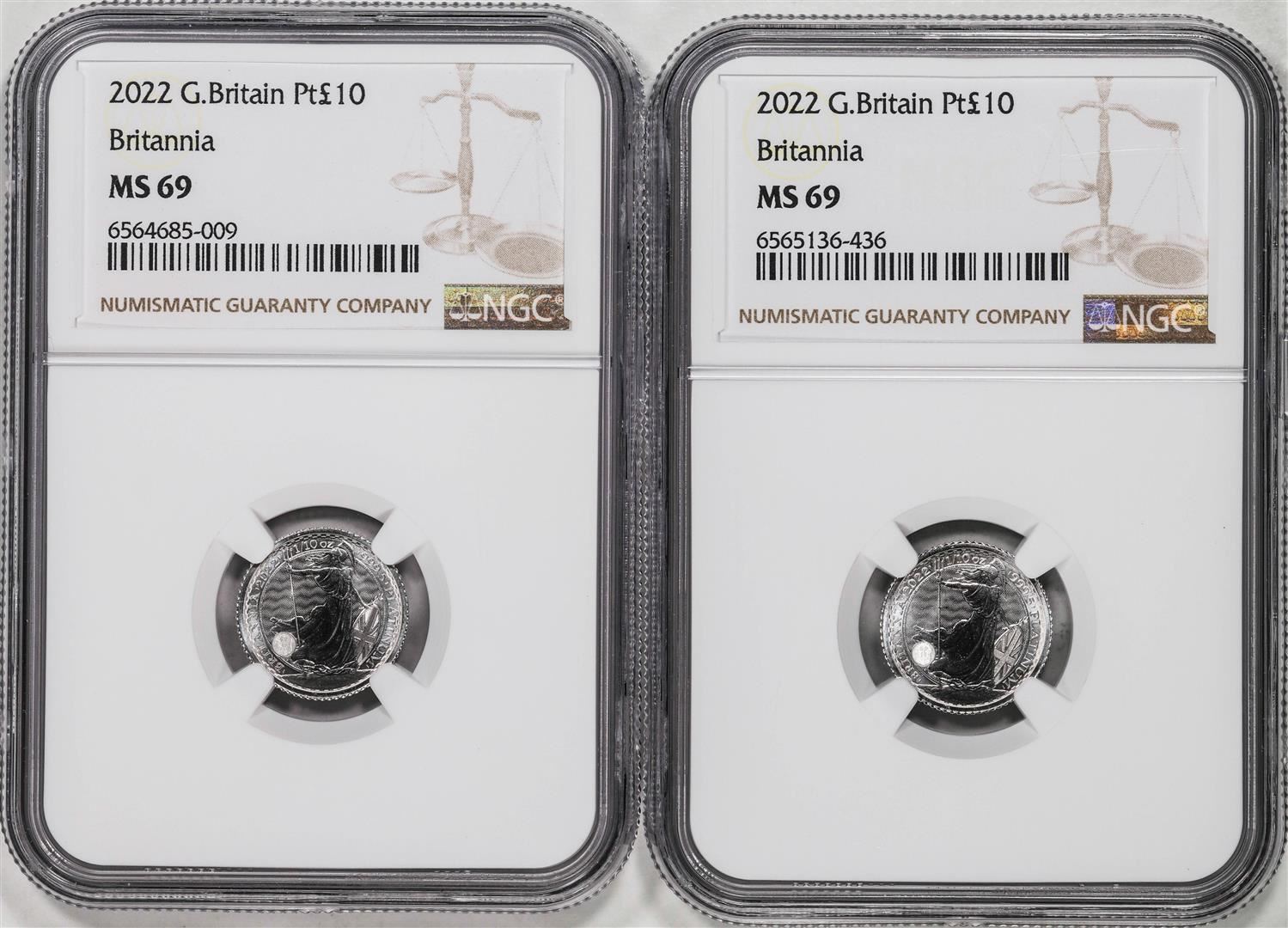 One Lot of (2) 2022 Great Britain 10 Pounds Britannia 1/10oz Platinum Coins NGC MS69. NGC Certified.