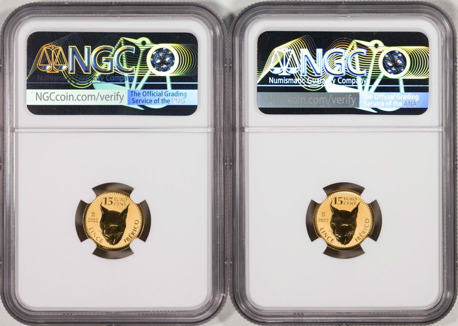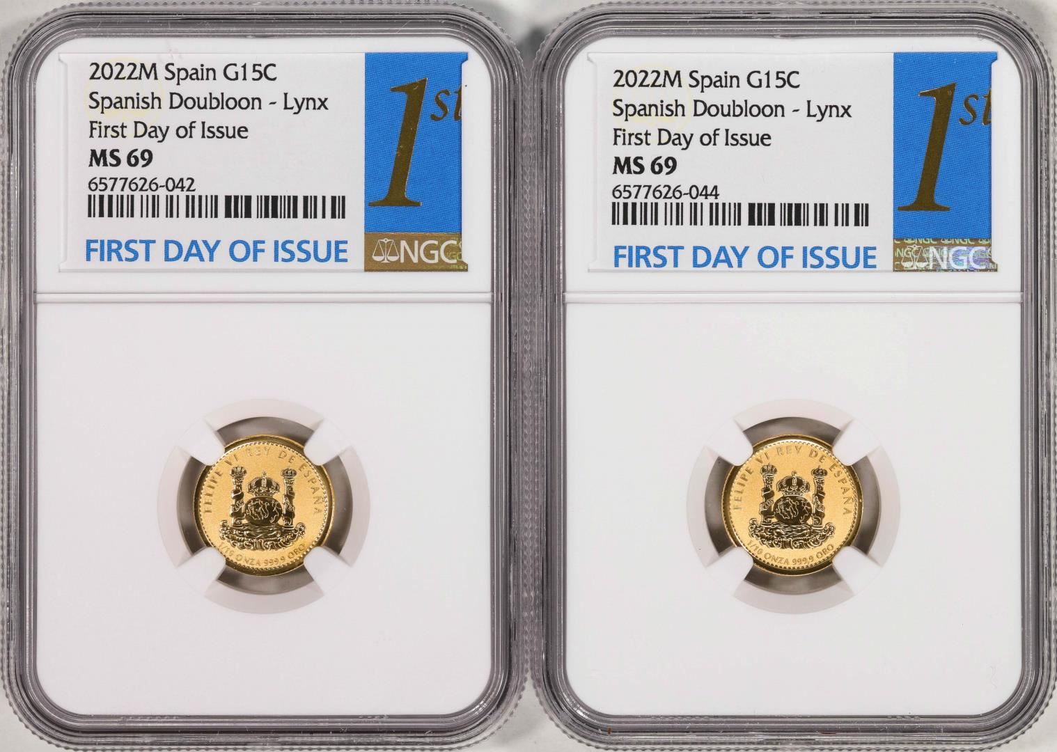 Lot of (2) 2022M Spain 15 Euro Cent Lynx Gold Doubloon Coins NGC MS69 FDOI